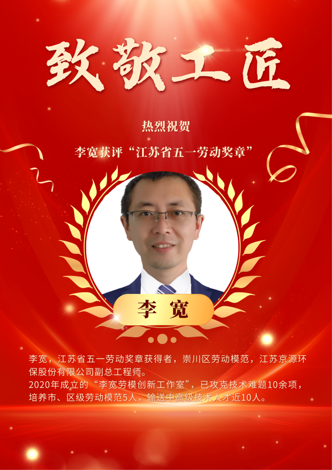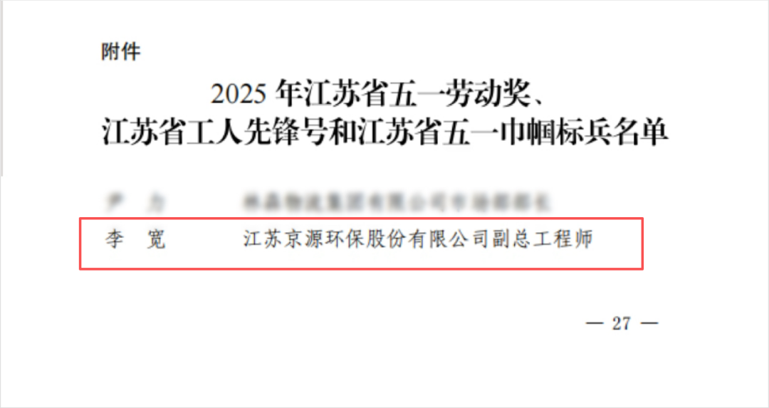 近日,江蘇京源環(huán)保股份有限公司副總工程師李寬榮獲“江蘇省五一勞動獎章”,這是省總工會、省人力資源和社會保障廳對其深耕環(huán)保技術、引領創(chuàng)新的高度認可。