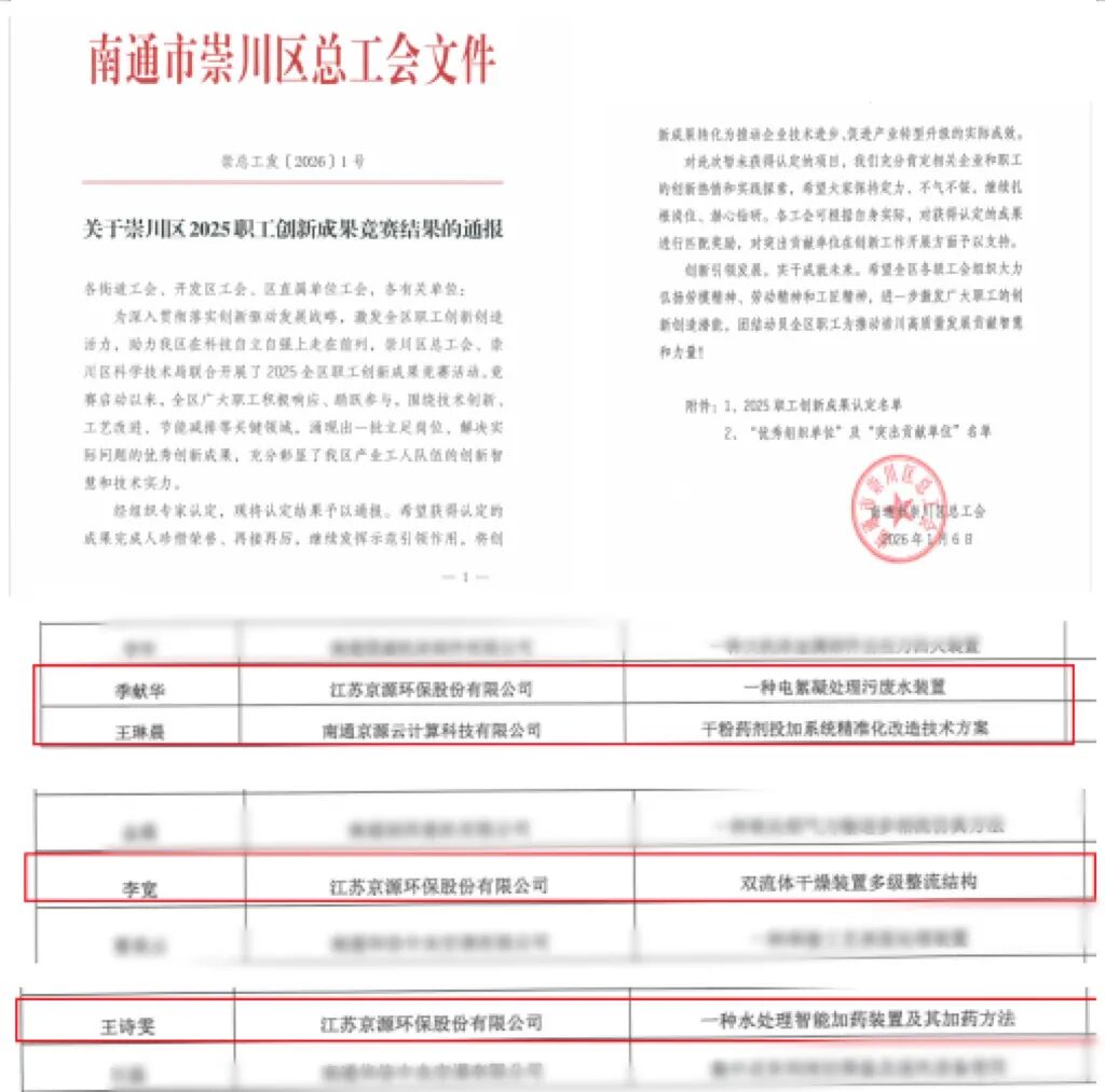 近日,南通市崇川區(qū)總工會(huì)與區(qū)科學(xué)技術(shù)局聯(lián)合發(fā)布《關(guān)于崇川區(qū)2025職工創(chuàng)新成果競(jìng)賽結(jié)果的通報(bào)》(崇總工發(fā)〔2026〕1號(hào))。江蘇京源環(huán)保股份有限公司(以下簡(jiǎn)稱:京源環(huán)保)共有四項(xiàng)職工創(chuàng)新成果獲得認(rèn)定,涵蓋技術(shù)創(chuàng)新與“五小”創(chuàng)新兩大類(lèi)別,同時(shí)公司被評(píng)為“突出貢獻(xiàn)單位”,充分體現(xiàn)了企業(yè)在職工創(chuàng)新體系建設(shè)和技術(shù)研發(fā)能力方面的扎實(shí)成效。