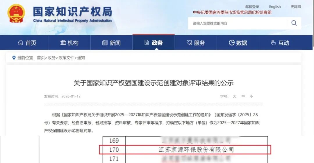 近日,國(guó)家知識(shí)產(chǎn)權(quán)局公布了2025年度國(guó)家知識(shí)產(chǎn)權(quán)示范企業(yè)名單,江蘇京源環(huán)保股份有限公司(以下簡(jiǎn)稱“京源環(huán)保”)憑借在知識(shí)產(chǎn)權(quán)領(lǐng)域的持續(xù)創(chuàng)新與扎實(shí)積累成功入選。