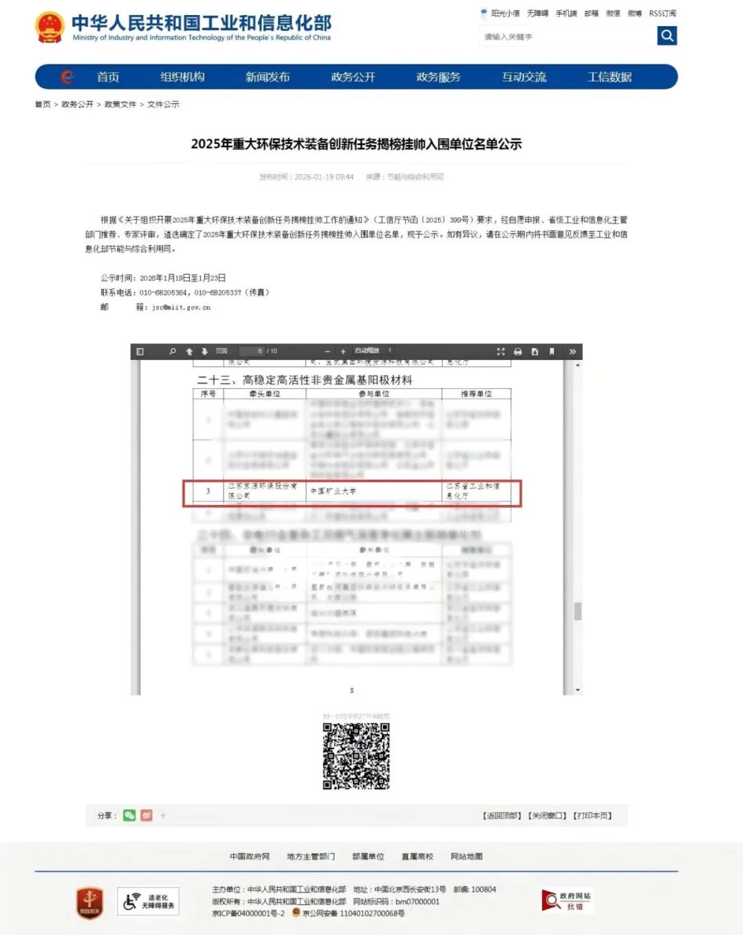 近日,工業(yè)和信息化部官方網(wǎng)站正式發(fā)布了《2025年重大環(huán)保技術(shù)裝備創(chuàng)新任務(wù)揭榜掛帥入圍單位名單公示》。江蘇京源環(huán)保股份有限公司(以下簡(jiǎn)稱“京源環(huán)?!保┳鳛闋款^單位,聯(lián)合中國(guó)礦業(yè)大學(xué)申報(bào)的“高穩(wěn)定高活性非貴金屬基陽(yáng)極材料”技術(shù)攻關(guān)任務(wù),成功入圍。